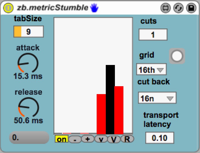 | Description: | This device allows for extending the metric cycle of audio material. It will cut back in time a certain amount of times (cuts) every tabSize amount of grid points. This is done based on the probability specified for each metric position to induce a cut. The stumbler currently needs a manual reset using the bang provided. |