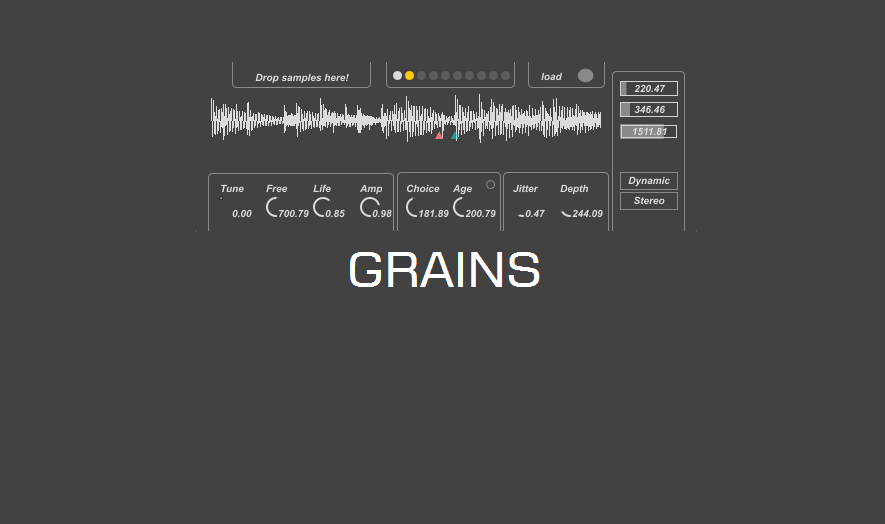 Thanks for this interesting grain device. It's pretty cool, even if some of the parameters are not very intuitive. I really hope you're going to improve it and upload more versions, it really has some potential for granular experiments. Few suggestion: