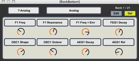 | Description: | RockBottom is similar to Automap for the un-supported controllers by using Live's MIDI map. you can control all plug-in parameters with a few encoders or sliders. also you can edit the orders of the plug-in mappings. insert anywhere and group it *custom mapping works only with same name of the device on the title bar. --ver3.3 plug-in parameters only,but more stable |