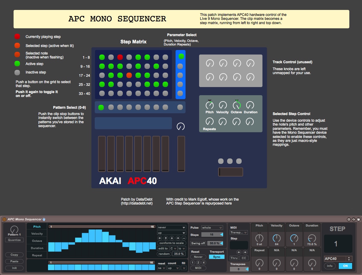 | Description: | Add APC40 hardware control to the Mono Sequencer to create basslines and melodies in minutes without ever touching a mouse or a MIDI keyboard. Unlike other grid-based step sequencers for the APC, this uses the grid to show you a complete sequence of up to 40 notes while you quickly adjust the pitch, velocity, octave, and duration of each step with the ringed encoders. This gives you much more precision as well as complete variety in note selection. This patch modifies the Mono Sequencer by Cycling '74 with a brand new control layout, but leaves all the original functionality intact, including multiple pattern storage, mouse editing, copy/paste, randomization, and variable timing. Check out this tutorial video to get a quick introduction to sequencing using only knobs and buttons: https://www.youtube.com/watch?v=FG0_c5RODrE Uses parts of the original APC Step Sequencer by Mark Egloff: http://www.maxforlive.com/library/device.php?id=877 |