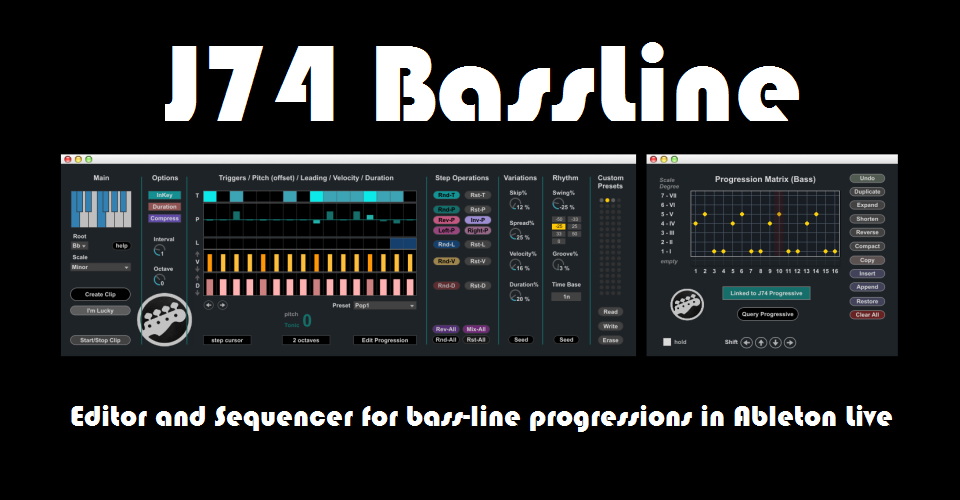 | Description: | J74 BassLine is a plug-in specialized in bass line progressions. The key idea behind this device is to have a single, flexible tool for bass line programming which combines both rhythm and harmony together. In terms of rhythm J74 BassLine makes use of groove, swing, legato, glide, accent and humanize dynamics. From the harmony point of view the tool works having knowledge of scales, chords and progressions, combining these with the rhythmic pattern creation. The bass-lines get automatically adapted to the progression, on a chord by chord basis, remaining in-key to the selected scale (if you wish it to). J74 BassLine can also be combined (and synchronized) with J74 Progressive for an integrated harmonic and rhythmic sketching environment within Ableton Live. For more info and tutorial video, go to: http://fabriziopoce.com/bassline.html |