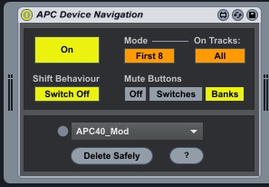 | Description: | Lets you navigate devices and parameter banks using the APC40's (Mk1 and Mk2) mute and solo buttons. Automatically control eight devices per track or use markers to expose them to the APC individually. This device needs some slight modifications to the original controller scripts. These modified scripts can be found here (original functionality isn't changed): https://github.com/martinpechmann/APC40-grab-release (Mk1), https://github.com/martinpechmann/APC40-MkII-mod-for-device-navigation (Mk2). I use this device with a modification of the APC40 script that incorporates the Push drum sequencer: http://martinpechmann.github.io/APC400000/ Quite a bit of time has gone into creating this device, so if you find it really useful, I would be glad if you would consider a donation via https://www.paypal.com/cgi-bin/webscr?cmd=_s-xclick&hosted_button_id=XNDYJ5LA2PAHY . Note that there is currently a problem when using Max 7. Deleting the device using the 'Delete Safely' button and then adding the device again will crash Live. |