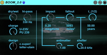 | Description: | BOOM is a distortion with an attached feedback-circuitry that can do anything from not too bad sounding DRIVE to TOTAL DESTRUCTION. actually, you might even get some nice-sounding textures out of it, but going by the interface,it's more about fucking things up. be careful with the 'impact' - knob! BOOM is for free but donations are highly appreciated! requires ableton live 9.1 and up and max/msp 6.1.9 and up |