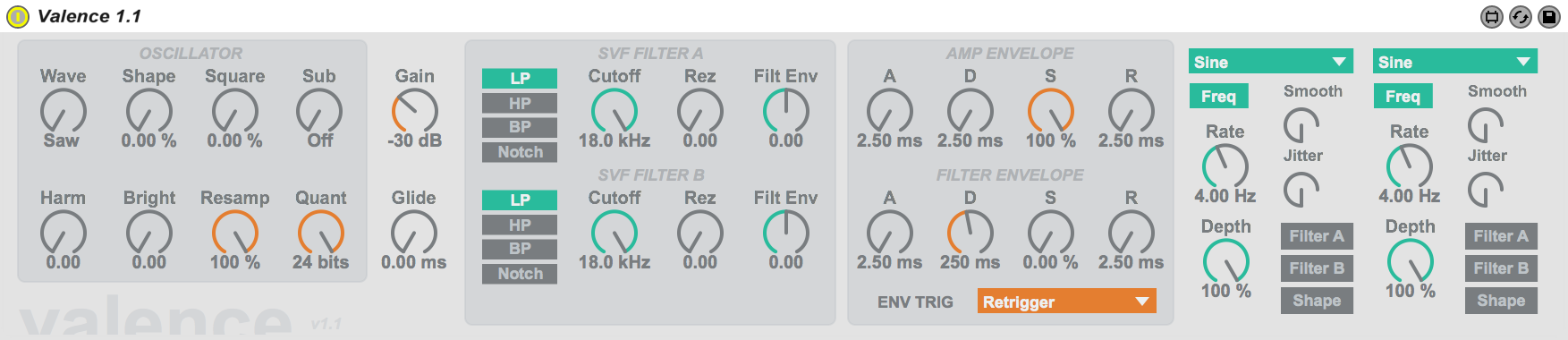 | Description: | valence is a single oscillator monophonic synth with some interesting sound shaping qualities. UPDATE: 2015-09-23 / improved envelope exponents - much more responsive now / fixed an error with the second filter cutoff exponent value / collapsed the sub oscillator into a single control - still all the same functionality, just easier for push integration / improved the push and automap functionality. there are now four banks of controls - each of the "blocks" represents a bank, more or less. features: / four oscillator modes: - saw (with two additional detuned saw waves via "shape")* - pulse (pulse width modified via "shape") - triangle ("shape" transforms it into a saw gradually) - triangle + ("shape" adds two additional harmonics) * the saw OSC has a built in LFO, and thus, the LFO is not routed to "shape" in this mode. / "square" is a square waveshaper / a flexible sub oscillator: - can be tuned to -1 or -2 octaves, or down a forth or fifth - selectable sine or square wave / harmonic FM controls via "harm" (harmonic factor) and "bright" (amount). the sub osc is unaffected by this - it directly modifies the incoming frequency pre-OSC / a bitcrusher via "resamp" and "quant" / a pre-filter gain control. keep it around -30 in most cases. cranking it will overdrive the signal into the filter. / serial-arranged SVF filters - filter A feeds into filter B. / amp and a filter envelope. the envelope triggering is assigned to BOTH envelopes. / two LFOs. routing is in the lower right portion of the LFO controls (you can route to filter A cutoff, filter B cutoff, and the oscillator shape). have fun, and let me know if you encounter any errors, or see anything can could be improved. |