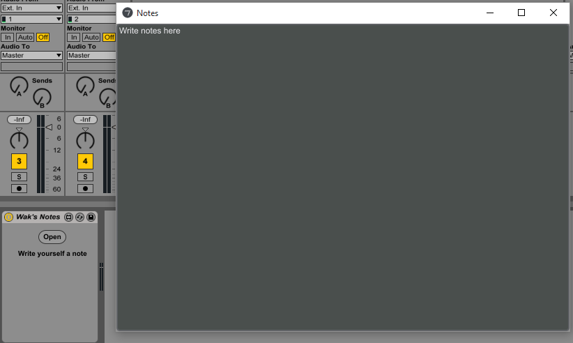 | Description: | Simple device for taking notes in Ableton. A window pops up when you load a project with whatever you write in it. You can also open the window up whenever you want while working on a project by pressing the "open" button. 1.1: -Fixed bug causing Notes to not be saved |