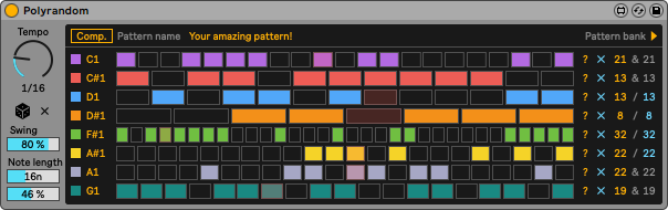 | Description: | Polyrandom is an 8 channel polyrhythmic drum sequencer, with randomisation, cycle length, length and target note controls for every channels. https://youtu.be/_hB2sLmr6Kg Version History : 3.o1 - Click on the device logo now shows numbers instead of sliders. 3.o2 - Updated to Live 10. (Important! If you're still using Live 9, please, stick with the old version! There are major UI changes in Live 10, these will look ugly under 9) 3.o3 - Random pattern change fixed 3.o4 - user request : full MIDI mapping 3.o5 - user request : independent velocity control 3.o6 - timing issue fixed, now it is tight 3.o7 - device now passes through MIDI messages, thanks to a kind user who pointed out the missing objects! 3.o8 - fully new clock generator, more stable and reliable 3.o9 - from now, users can exclude channels from the global random/reset 3.1o - bug fixed (velocity exclude now works!); preset save and load implemented 3.11 - Ableton banks support added for Push, improved clock, now 100% message/bang based, no more signal conversion, note lengths are now in time intervals 3.12 - save/load bug-fix 3.13 - minor UI fix 4.oo - a lots of new feature, fully re-designed interface 4.o1 - minor fixes on hints 4.o2 - lots of new feature, check out the latest video! 5.oo - new UI, bug fixes, mappable API and dual CC control for every channel 5.o1 - timing/clock bug fixed under 11.1 5.o2 - Apple silicon check 5.o3 - dynamic UI 5.o4 - minor UI update 5.o5 - Live 12 compatibility check |