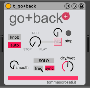 | Description: | UPDATE 2021 - auto mode (your sound trigger REC and PLAY) - sync mode redesigned - new control mode with one knob (to REC) and one button (to STOP) - minor bug fixed Go+Back Realtime OneKnob Reverser. Max for live device for Ableton Live. Go+Back is a max for live device that allows to record and playback musical phrases straight and reversed in real-time. With just one knob you can control all the process: choose the length of the phrase and the start/stop of the playback. video demo: https://youtu.be/wQIbs4aifnY video performance: https://youtu.be/ScZKjQpDTmg video update 2021: https://www.instagram.com/p/CN6y50HKg-8/ |