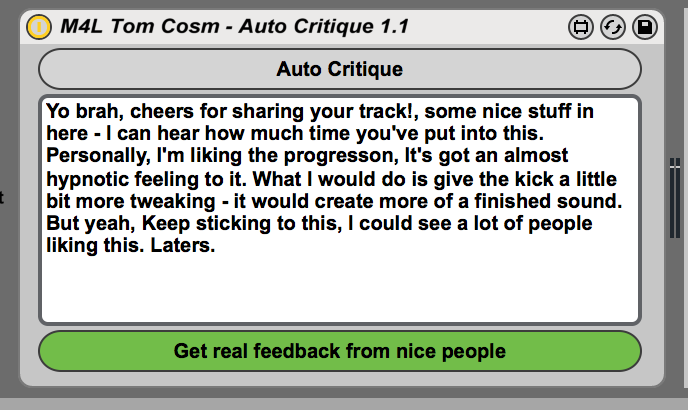 Description: This patch automatically generates some feedback you can copy/paste to people who send you tracks. Simply click the Auto Critique button and it will randomly throw together a string of words, telling someone what you think about their music.