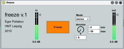 | Description: | "freeze" is a jitter based freeze plugin with denoiser (i used parts of algorithm by Jean-Francois Charles: http://www.jeanfrancoischarles.com). Hit the Big "Freeze" button to freeze something. Put it off to bypass the dry signal. You have 3 possible freeze modes for stereo/mono sources - stereo for stereophonic freezing (you will hear the phase differences very well) and mono for equal L/R freezing. You can use denoiser to gate the quite/noisy parts of your frozen sound. Simply raise up the value to hear the effect. Attention - your buffer won't be saved with your patch!!! Have fun and please report any bugs! |