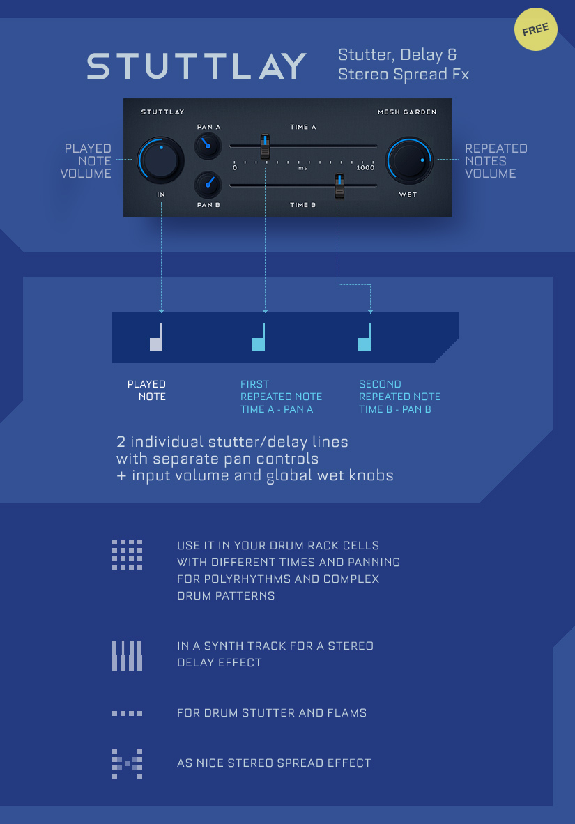 | Description: | Stuttlay is a stutter-delay fx to create stutter-type effects, custom-panned delay lines, and stereo spread sounds. View the image on the right for more info. All parameters are mapped to Push knobs and midi mappable. - IN: Note played input volume - PAN A: Panning position of TIME A - PAN B: Panning position of TIME B - TIME A: Delay line A from 0 to 1000 ms - TIME B: Delay line B from 0 to 1000 ms - WET: Global wet effect amount Free download in the Gumroad page. |