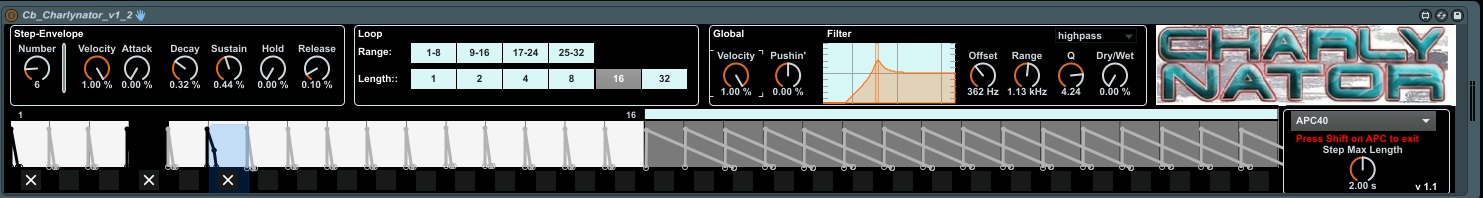 | Description: | This is the ultimative Slicing tool which will surely fuck up your cpu ;-) It takes an audio signal and routes it through 32 indiviual controllable ADSHR volume envolopes and a global filter section which let's the cutoff to be controlled by the envelopes which are triggered by the built in step sequencer. You can choose length and region to be looped. The global Push control lets you open up the gates globally and the global length control let's you globally adjust the length of the slices. There is also a global velocity control. It supports the APC40 as a step sequencer but you can still use your apc40 as you're used to it by pressing the shift button which will exit the Charlynator's step sequencer mode. When you reenter the track with the Charlynator it switches the APC to charlynator mode again. You can also use many charlynators in different tracks. I really hope the apc mode is still working as some live version crashed using the device and i could not retest it now. Let me know if there are any problems. Oh... I've even written a manual: Charlynator v1.2 Manual What is the Charlynator ? ------------------------- The charlynator is a Max4Live Audio device with an integrated step sequencer for use with the Akai APC40 Midi Controller. Each step in the sequencer can trigger a adshr-envelope (attack-decay-sustain-hold-release) curve which is used to slice the audio signal routed through the device. The envolope controls the volume of the audio material and additionally a filter effect can be controlled by the envelope. How to use the Charlynator? --------------------------- Add a charlynator device to an audio track in Ableton Live. While the Charlynator device is selected the behaviour of the apc40 changes to control the Charlynator device. As soon as another device is selected the charlynator device disables it's APC40 Support automatically and you can use your apc40 the same way as without charlynator device. Note that you should at least place one device on each track (for example the Utility device) in order to make the disabling work. If you do not have a device on the track which gets selected the charlynator will keep control of the apc unless another device is selected. Features: --------- Step Envelope Section: The knobs in this section control one of the 32 envelopes assigned to each step of the step sequencer. Step Envelope Section: Number Knob: This knob allows you to select one of the 32 envelopes to be edited with the other knobs of this section. This number is automatically set when toggling a step with the apc40. Step Envelope Section: Velocity Knob: This knob controls the maximum amount of the current envelope. While the charlynator is connected to the Apc40 this parameter can be controlled with the APC40'S Track 1 Knob. Step Envelope Section: Attack knob: This knob controls the attack time of the current envelope. While the charlynator is connected to the Apc40 this parameter can be controlled with the APC40'S Track 2 Knob. Step Envelope Section: Decay knob: This knob controls the decay time of the current envelope. While the charlynator is connected to the Apc40 this parameter can be controlled with the APC40'S Track 3 Knob. Step Envelope Section: Sustain knob: This knob controls the sustain level of the current envelope. While the charlynator is connected to the Apc40 this parameter can be controlled with the APC40'S Track 4 Knob. Step Envelope Section: Hold knob: This knob controls the hold time of the current envelope. While the charlynator is connected to the Apc40 this parameter can be controlled with the APC40'S Track 5 Knob. Step Envelope Section: Release knob: This knob controls the release time of the current envelope. While the charlynator is connected to the Apc40 this parameter can be controlled with the APC40'S Track 6 Knob. Loop section -------------- This section allows you to control the loop settings for the step sequencer. Loop section: Range 01-08: This knob sets the range to step 01 to 08. While the charlynator is connected to the Apc40 this knob can be triggered with the APC40's scene 1 button. Loop section: Range 09-16: This knob sets the range to step 09 to 16. While the charlynator is connected to the Apc40 this knob can be triggered with the APC40's scene 2 button. Loop section: Range 17-24: This knob sets the range to step 17 to 24. While the charlynator is connected to the Apc40 this knob can be triggered with the APC40's scene 3 button. Loop section: Range 25-32: This knob sets the range to step 25 to 32. While the charlynator is connected to the Apc40 this knob can be triggered with the APC40's scene 4 button. Loop section: Length Button: These knobs set the length of the step sequencer loop. Global section -------------- This section controls behaviours applied to all of the 32 envelopes of the step sequencer. Global section: Velocity knob: This knob sets a global factor to the velocity. At the minimum level all envelopes are effectively disabled by setting all velocities to 0. At the maximum position all envelopes are set the full amount of the velocity set in the envelope. While the charlynator is connected to the Apc40 this knob can be triggered with the APC40's device 1 knob. Global section: Pushing knob: This knob modifies all values of all adshr envelopes. At the minimum level all values of the envelopes are set to minimum. At the center level all values of the envelopes use their individual amounts. At the maximum level all values of all envelopes are set to maximum. While the charlynator is connected to the Apc40 this knob can be triggered with the APC40's device 2 knob. Global section: Filter offset knob: This knob modifies the basic offset for the filter's cutoff frequency. While the charlynator is connected to the Apc40 this knob can be triggered with the APC40's device 5 knob. Global section: Filter range knob: This knob modifies the amount in which the incoming signal increases the filter cutoff frequency