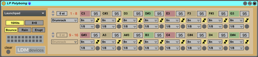 | Description: | This patch brings polyrhythmic chaos to your Launchpad! Based on the boiing monome patch, this allows for 16 bouncing lights to trigger midi notes from a drumrack or instrument. Expanded functionality includes options for changing velocity, independent speed, and movement type – Bounce, Rain or Erupt – all changed from the Launchpad itself. Within the patch GUI you can also change the note lengths, transpose and scale options. The scale can be set for all 16 notes or each page can be set independently. This way the notes can be routed to different tracks, and using a MIDI Range patch to limit the notes which are received by each track. (I will provide a link to my own MIDI Range patches which automatically set their range to match the each 8 notes from the Polyboing patch) |