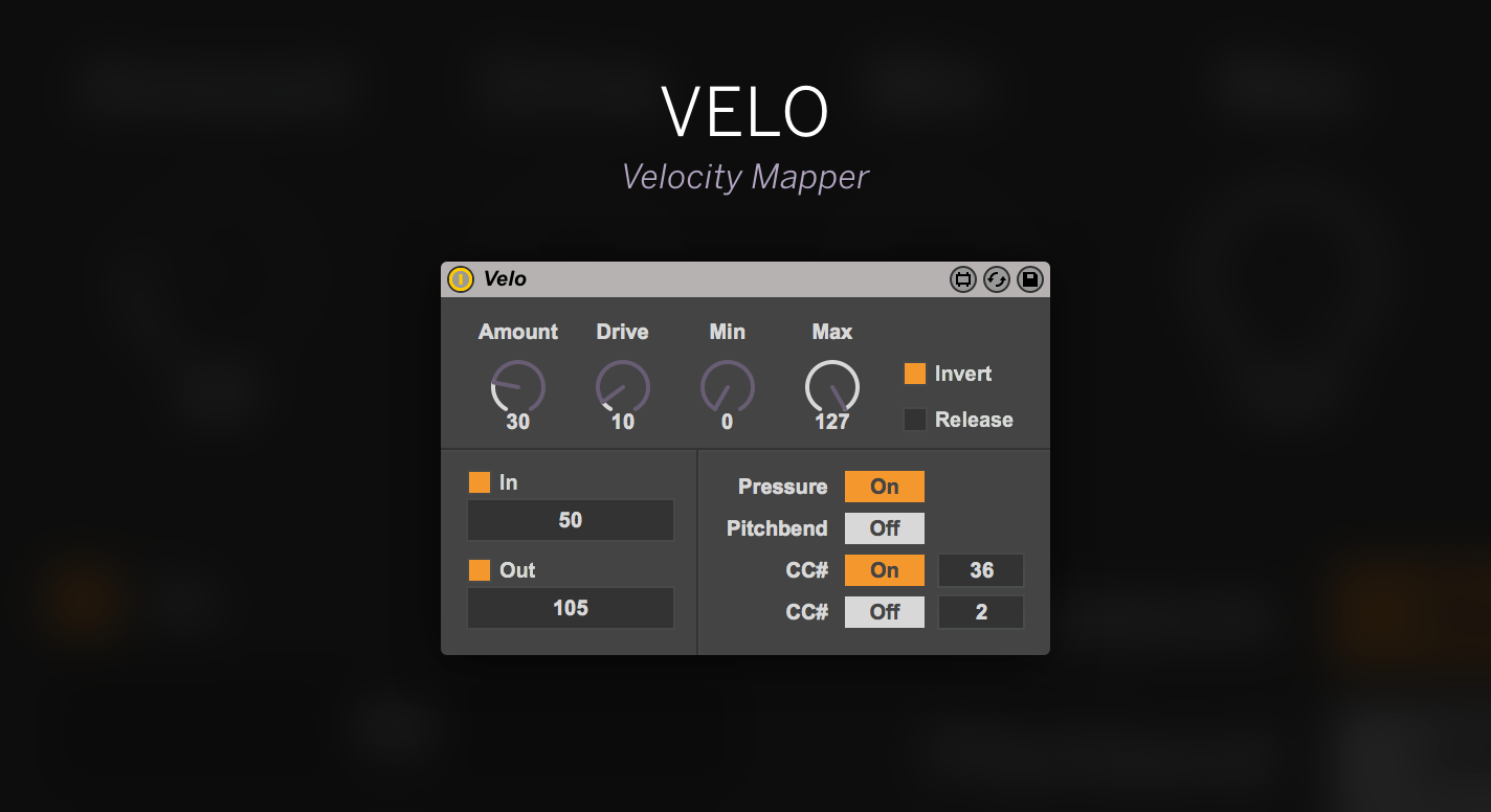 | Description: | This device lets you play around with velocity data and map it to different destinations. The final output data can be mapped to aftertouch, pitchbend and CC parameters at the same time. Features: - Amount and Drive to control intensity - Low and High to set minimum and maximum values - Invert intensity (highest value becomes lowest value) - Note Off to also trigger data output on note off for nice effects - Input and output monitoring Also check out my other devices. And if you like and use this device, please come back to rate or leave a comment. |