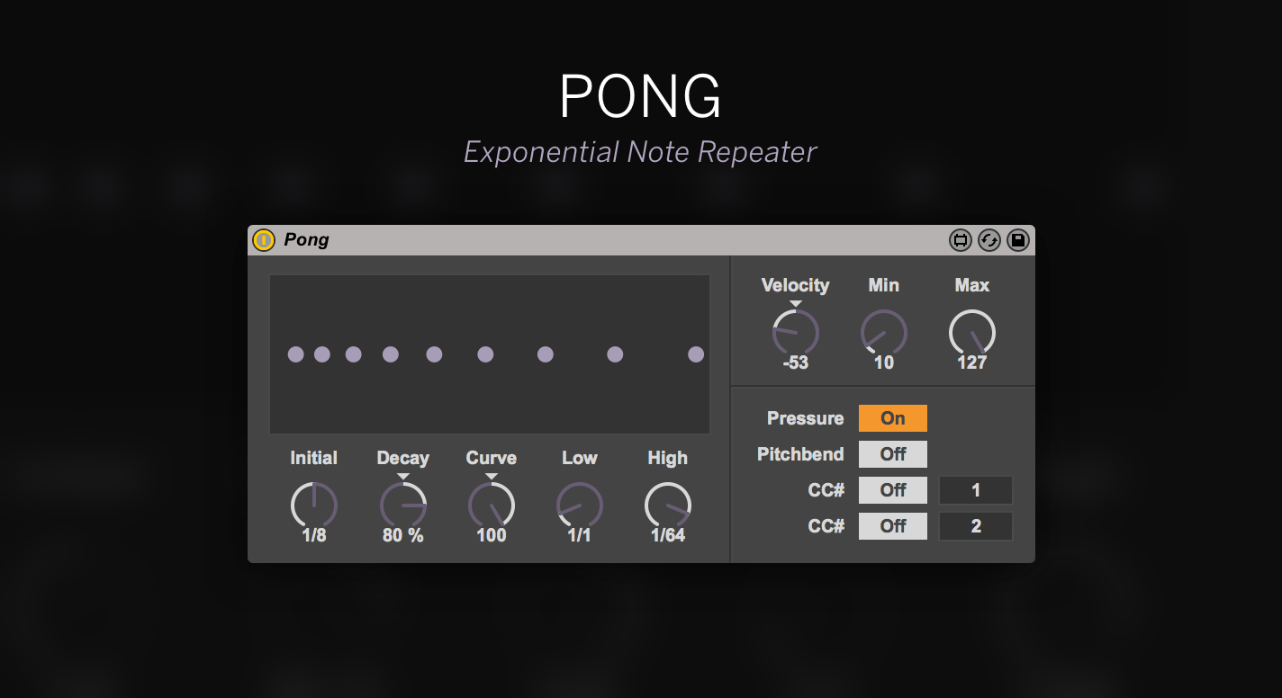 | Description: | Pong is a note repeater that creates exponential or logarithmic repeats. Control the speed of repeats, adjust note decay and velocity, and use the ouput to modulate other devices by mapping it to multiple destinations. Features: - Set the initial note value of the repeats - Define the speed increase and decrease of repeats with an exponential or logarithmic curve - Control the range between lowest and highest note value - Adjust the decay of each note in relation to the repeat time - Visual representation of note repeats - Increase or decrease velocity during the repeats within a defined velocity range - Map velocity to multiple destination like aftertouch, pitchbend and CC parameters Also check out my other devices. And if you like and use this device, please come back to rate or leave a comment. |