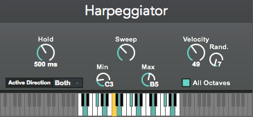 | Description: | An arpeggiator with a twist, this device lets you create arpeggios by sweeping across held notes in every octave, like a glissando on a harp, hence the name. You can sweep manually with a fader or knob, automate it, or use an LFO or sidechain signal to dynamically control the arpeggiator. Also functions well as a MIDI guitar strummer. 30/03/17 UPDATE: Version 1.3 - Fixed bugs in JS code 12/03/17 UPDATE: Version 1.2 - Switched note handling from JS to Max for performance improvement and to give note events priority. This fixes the glitch where notes are dropped when navigating the Live device chain. 06/03/17 UPDATE: Version 1.1 - Added full keyboard display - Added "All octaves" toggle - On state copies all held notes across every octave - Off state allows user to sweep over held notes only - Added "active direction" control - Allows user to disable sweeping in either direction, allowing for only rising or falling arpeggiation - Added current sweep position on keyboard - Added current sweep range display on keyboard - Improved UI - Reduced sweep range to 88 key piano range |