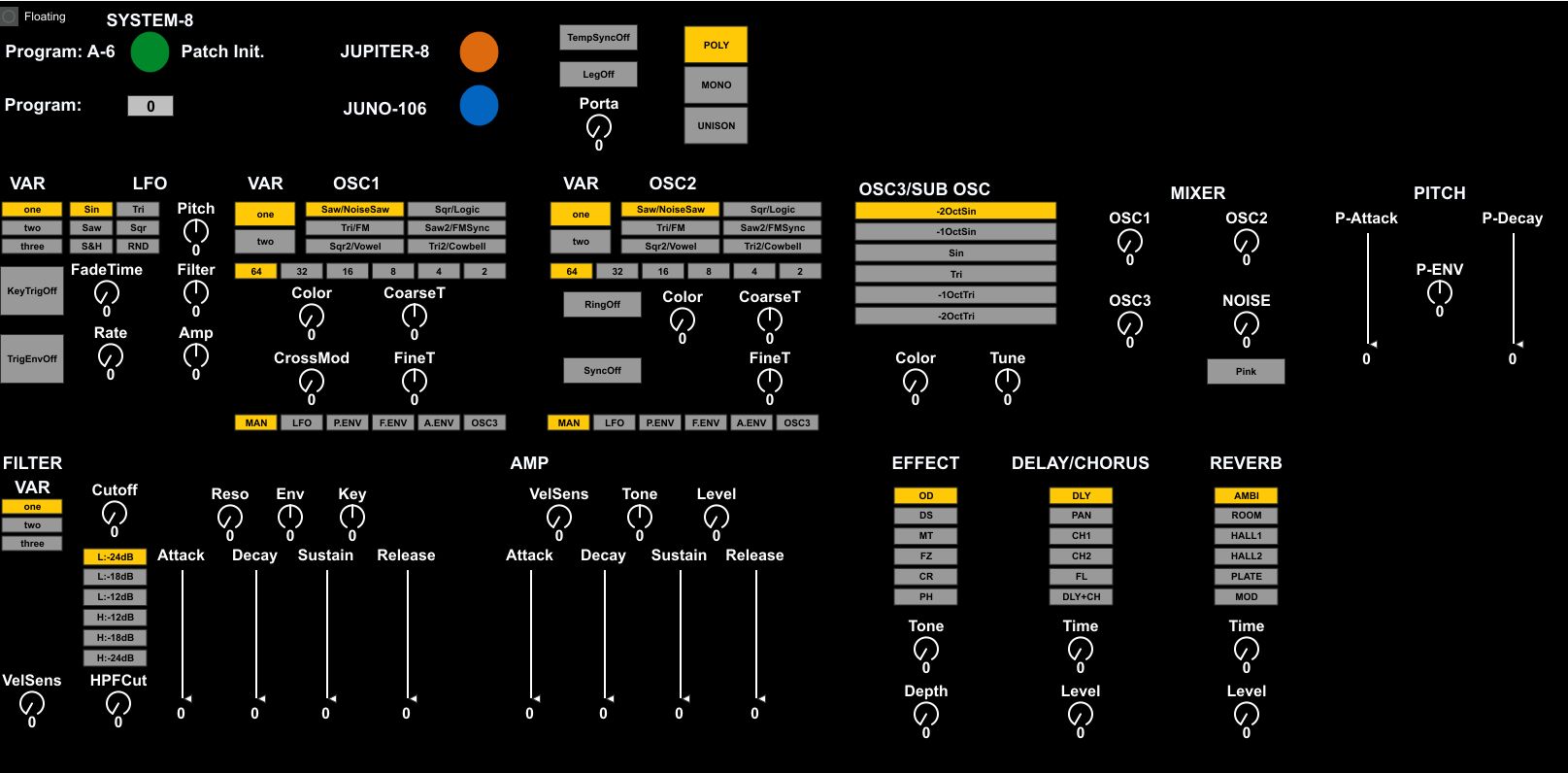| Description: | Initial build of a M4L MIDI Controller For the Roland System-8. - Click the button next to Floating to get an Independent M4L window. - 2 way feedback of MIDI Signals. - Controls are mapped to Push 2 controller. - Green System-8 button goes to Program A-6 which I have mapped to a Patch Initialise. - Jupiter-8 and Juno-106 buttons. Need to develop separate M4L Device. - Use with External Instrument in Ableton. - Note: Current Bug on load where you need to initialise the patch. This is my first M4L Device and it works for my use, but thought it might be useful for others. Any constructive feedback and suggestions would be excellent. |