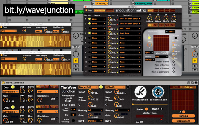 | Description: | Wave Junction is a four voice paraphonic synthesizer. Wave Junction Features: Two Multi-wave Oscillators (waves) plus user Wavetables and FM. Three Multi-Mode Filters - can be run either series or Parallel each with: LP/HP/BP 2+4 Pole Transistor Model Diode model 5x syncable LFOs - yes FIVE! 5 ADSR Envelopes 12 Slot Mod Matrix Highlights: OSC sources - Saw/Pulse/Tri/Sine all with Super variants for detune density Wavetables: 16 preset waves, plus user uploadable wavetables Variable Ratio FM depth for each wave combine to create rich sources Great sounding filter types: LP/HP/BP 2/4Pole, Transistor and Diode with distinct resonance character. Cohesive integration with Ableton Push |
