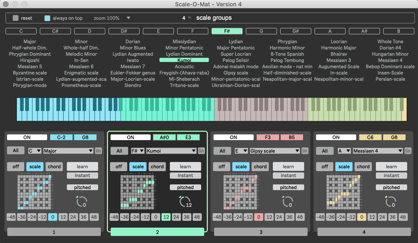 | Description: | Scale-O-Mat 4 is a M4L Scale Device for Ableton Live, where you can change a scale over your whole Live Project. Scale-O-Mat 4 is great for composing music and for plaing live, to change the scale and the rootnote on the fly and always stay in the same scale. No matter what style you're playing, from soundtracks, orchestral works, EDM, drum & bass or rock music - Scale-O-Mat is a great helper to play always the right notes. Scale-O-Mat is now fully MPE compatible If you want to experiment with musical scales or even to keep the Scales of your whole Liveset under control. Create up to four independent Groups of Scales or Chords or even Notes to manipulate random sequences and bring them to new musical harmonies. Scale-O-Mat 4 is a customized Version according to an idea from Tyondai Braxton. Features of Scale-O-Mat 4: - Scale-O-Mat 4 comes with 2 Devices - the Scale-O-mat Device itself and the Instant Scale Device - Assign up to 4 different Groups with various Scales - More than 40 Scales - All Scales from Push 1 + 2. - Scale Collection from Tobi Hunke. - Filter or Pitch the Notes that are not fitting into the Scale - Transpose since Version 4.1 - online update check - pre/post pitch since 4.2 - the possibility to switch the learn behaviour - minor bugfixes sice 4.3 - MPE compatibility |