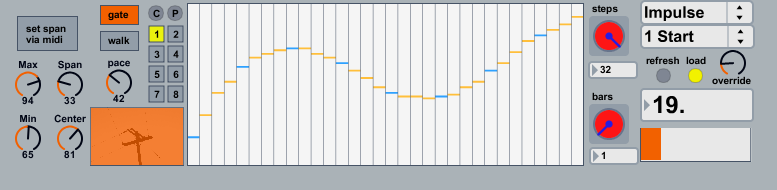 | Description: | This midi sequencer uses a drunken walk random number generator, when enabled, to overwrite output levels. These output levels can be used to drive downstream effects, knobs, etc. Eight presets available, as well as the ability to set min and max note levels via midi key inputs. Enjoy! hint: link to a rack's chain select with different effects spread about the rack chain for beat glitching goodness ;) Version 1.3 saves the output path to the Live set. Simply press the load button to load the path upon opening a set. This variable is global so one button press will load the saved paths for ALL instances of the device. |