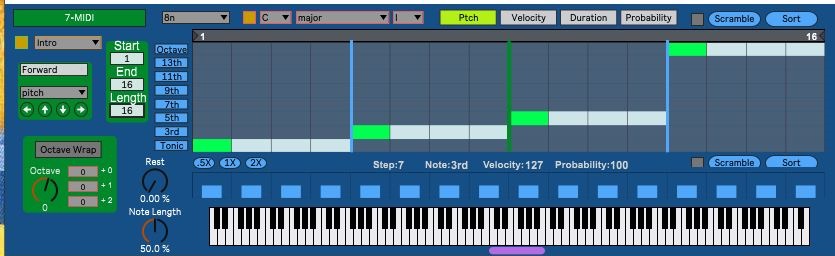 | Description: | Hi, The Proletarian is a conceptual blend between my D1 Proc11 and Progenerator sequencers. In particular, it step sequences (like the D1) the Tonic, 3rd, 5th, ..., 13th of the current Key, Scale, Degree (like the Progenerator), which can be automated or sequenced by my global Chord Control Center (enabled by the nearby Orange button). If you want to play any note, use the D1. Also, there is a .5x, 1x, 2x speed sequencer, based off of the main Speed. Both of these have an AutoScramble feature. The "Octave" knob sets the Base octave. The "Octave Wrap" button wraps the runover notes of the Scale back down to the bottom of the Base octave. The 3 numbers next to the "Octave" knob give probability weights to the Base, Base+1 and Base+2 octaves. It also has 4 different sections (up to 64 steps each): Intro, Verse, Chorus and Outro. The "Note Length" knob decreases the duration of the notes, relative to the Speed. If the Speed is 2 Bars, then a Note Length of 50% gives a 1 Bar note every 2 bars. The "Rests" knob controls the probability of a rest occurring on a given step. Enjoy P.S. It can send midi (note,velocity) to appropriately wired MFL Audio Devices (currently, just my Convolvor). Also, it can export midi Clips of the constrained random output. Update: The main new feature here is the bright orange button next to the Intro, Verse, Chorus, Outro (IVCO) menu, which I call the Section menu. When the new, bright orange button is off, this sequencer is not being controlled by the new, unseen force of the global IVCO sequencer found here https://maxforlive.com/library/device/5625/introversechorusoutro Also, I added a new Octave row to the sequencer |