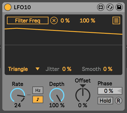 Something else that bothers me about the Ableton included LFO is that the rate knob behavior of beat synced mode is opposite of the behavior in hertz mode. That is: in hertz mode, if you turn the knob left the LFO slows down and if you turn it right it speeds up. However, in beat mode, the behavior is reversed and turning the knob left speeds it up.