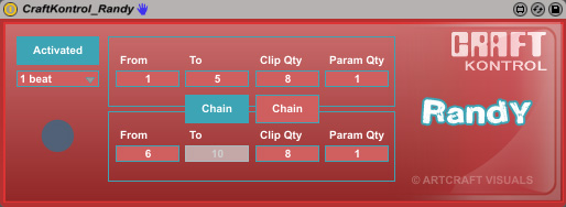 It’s a simple random clip launcher and controller based on a synced time, with a settable tracks and clips range up to 255. There is up to 8 controllers available, with automatic assignment to the 8 first knobs on the first device of the launched track. (designed for the 8 macros of a rack) There is a track and clip number chain between the two launchers. |