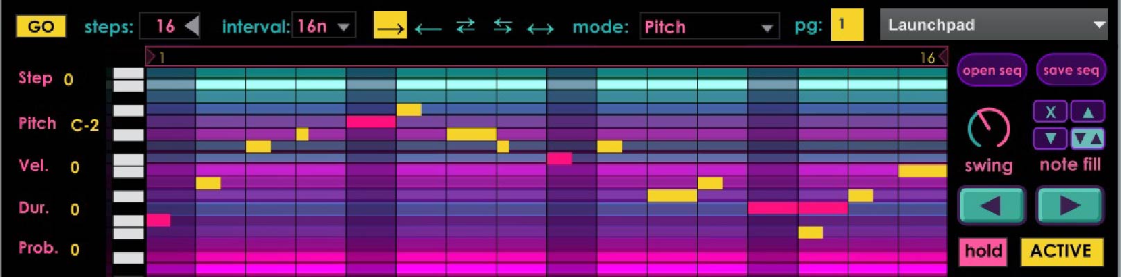 | Description: | This device allows the Launchpad to draw arpeggios like a step sequencer and per-step control of velocity, pitch, duration and probability as well as swing, hold, pattern shift and sequence direction. Everything is mappable. Use multiple instances across tracks to have other instruments follow chord changes from another midi track... like a band following the chord progressions of a song. Place on a midi track in front of an instrument and set the track to receive Midi In from a separate track (keyboard). Set Launchpad to User 2 mode. Choose Launchpad from STARP drop down and click ACTIVE. Start Live clock and bang out some chords. Side buttons on Launchpad select Velocity, Pitch, Octave, Duration, and Probability. Top buttons shift pages < >. Has setting for Input Hold, Note Fill, Swing and pattern shift left and right. Live clock must be running. Works with my Launchpad Mini seems to work on my old APC40, so should work with older LPs but probably not Pro. Use multiple instances by only having one Active at a time. I tried to incorporate everything a good ARP should have but the one thing still missing is POLYPHONY. As far as I know it's not possible with live.step so I may end up rebuilding with live.matrix (like Arpeggio Designer was anyway) Holler if you know a trick! Also would really prefer the Probability to default at 0 instead of 100 so you dont get the one note machine gun when starting it up. I tried but wasn't able to change the Inital Value for the Probability. Again, holler. This is my first attempt working with M4L and only because I couldn't find a device that would do what I wanted. Why? I dunno, it seems like a great idea to me and, with all the step sequencers around, I'm surprised nobody else incorporates an arpeggio function. It was sheer necessity that forced me to cobble this together from other devices... and it was only through tearing them apart that I was able to learn how they worked. I started with the LaunchpadStepSeq by Novation and wired in some bits from Arpeggio Designer by TetMusic and solved SO MANY problems searching the M4L forums. I'm a musician not a programmer so it's a bit messy. There are probably lots of things that could be done better or are completely unnecessary. Known quirks: When pattern is shifted left or right, the Launchpad will reset the pattern when page is changed. Idk how to fix. Note Fill: when more notes are output than selected, note fill will recycle the input notes and add an octave up. I rewired it to add an octave down and alternating option but they don't really follow the sequence pattern. It may, for example, fill the highest note shown on the piano roll with the lowest pitch. |