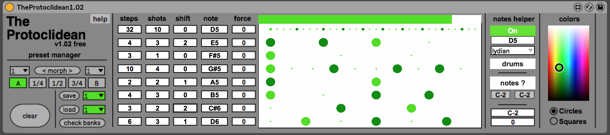 | Description: | The ProtoClidian is a MIDI notes generator based on the Euclidean sequencer concept. Euclidean algorithm helps to divide a time interval & to place notes "as much evenly as possible" into that time interval. It drives into nice rhythmic or melodic patterns. Sorry for the 1.02 problem. Max8 included in Live messed my freeze/unfreeze and the javascript core of this device wasn't ... included. 1.03 is ok ! PAY ATTENTION: I coded it 7 years ago (around 2011) AND if I'd have to do it again, I'd code it VERY differently, as coding skills improved. Take it as it was and eventually modify it as you want. I don't do any kind of support on this device anymore ! |