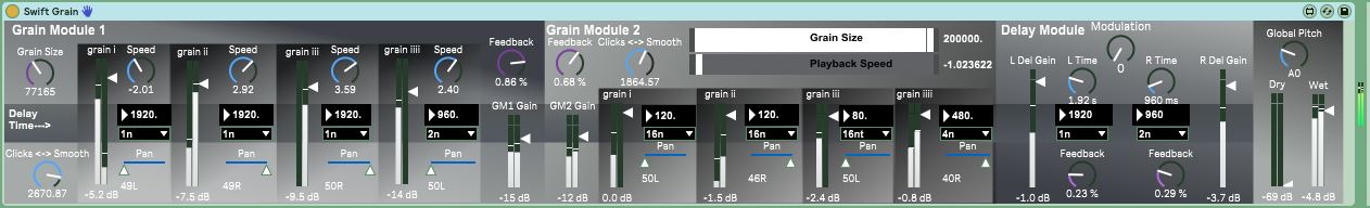 | Description: | 1.8 is here! Let's be honest. The Second Swift Grain Module, aka the Swift Grain Mini-2. sounded a little bit terminal, but that is fixed and it is very much ALIVE and sounding great, with a new windowing approach on the sample-grains. Enjoy! -------------------------------------------------------- 1.7 is here! The effect was a little dense, so we turned it into 3 effects! 2 simpler modules and the original Swift Grain device. ------------------------------------------------------------ 1.5 is out and each module has received a knob to smooth out the clicks. It's the Click.Smooth knob, aka the click kill knob, and there's one for each grain module. It sounds pretty gnarly with the clicks too! ------------------------------------------------------------ Swift Grain is a real-time granular delay effect where you have control over individual grains. You can hear what the effect sounds like here: https://soundcloud.com/kylehinton/swift-grain-demo-max-for-live-device Play audio into the plugin and have surgical control over the grains and delay taps to create a calming atmosphere or a glitched out wall of sound. There are two grain modules that render audio into granulated ant stuttered samples in real time. Each module has 4 grain channels and each of those channels has a delay line, volume and panning control. Each module approaches the granularization effect differently. Grain Module 1 gives control over the rate at which stutters occur, and the speed/pitch of each individual grain channel. Grain Module 2 gives control over the window size of the grains and the speed/pitch at which they are all played. There is a ton of control to create walls of granulated sound or to create more subtle atmospheres. The feedback on each module is global for all the grain channels. The Delay Module will give move delay options for both left and right output. Turn the modulation knob up and below 10 to get a flanging, tremelo effect. Turn it up farther to melt your eyeballs with modulation. The Master control section will let you mix the dry and wet signal. There is also a Global Pitch knob to keep the pitch, for all grain modules, in better musical sync, if that's what is desired. |