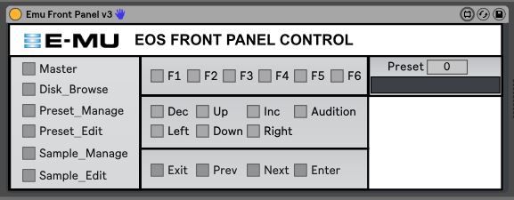 | Description: | Provides control of most front panel buttons for Emu IV samplers running EOS 4.0 or above. May work on earlier builds of EOS but hasn't been tested. |