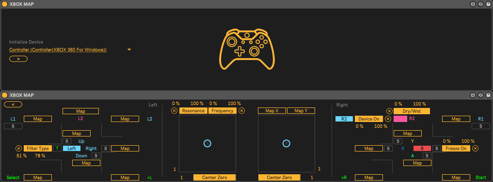 | Description: | Another gamepad controller mapper. I made this because I was excited by the idea of controlling sounds with my gamepad, but none of the available m4l devices worked correctly with my third-party Xbox controller. And so I started by modifying one of those devices, got a bit carried away and built a whole new UI for it, amongst other changes. I am planning to add midi notes triggering in future updates, whenever that may be. This devices was built upon Freebox Gamepad Control 1.0 by veedjee http://www.maxforlive.com/library/device/2662/freebox-gamepad-control The image of an Xbox controller by Juraj Sedlák https://thenounproject.com/yumminky/collection/xbox-one-console-outline/?i=1067328 P.S. It's a mess inside and I'm not even ashamed. |