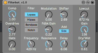 | Description: | Inspired by classical anaologic filter banks, this effect unit was created. Filterbot is an audio filter, sound bending and distortion unit. You can completely warp your audio data, add overtones or just give your sound a certain coloration. |