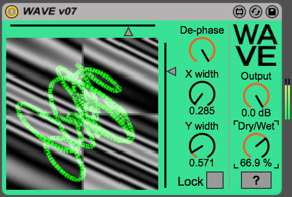 WAVE is a hybrid wave terrain and waveshaping effect for creating gnarly distortion and destructive timbres. The left and right input channel are convolved together to create lissajous figures over a complex wave terrain, which the user can specify the area of. A "de-phase" parameter can make mono inputs work better. The output will always be mono.