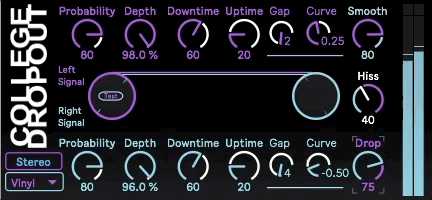| Description: | College Dropout 2.2 - an update of my previous tape/vinyl warping effect. What is it: The College Dropout 2 is the audio slacker simulator. With this, you can replicate the heartwarmingly crappy random volume dropouts and pitch warping effects from your favorite pieces of janky analog trash. Yeah, there’s a bunch of really nice tape effects out there, but I wanted something with deeper customizable controls for the volume drop, and a pitch-dropping/wow & flutter effect that was more organic sounding and didn’t have the latency issues some other devices had when warping. Overview: There are three primary modes for the effect -Tape (volume drop) -Vinyl (pitch drop) -Failure (volume and pitch drop) You can also set the left and right channels to operate individually or in unison with the Stereo/Unitary button. The audio drops are completely random, based of of a metro object running random numbers against the probability dial. Controls: Probability - Chance of a dropout triggering. Depth - How far the dropout will go (100% drops the audio out completely). Downtime- How long it takes for the dropout to reach its minimum. Uptime - How long for the dropout to return to its default. Gap - How long the dropout stays at its minimum. Curve - You can dial in either a linear dropout rate or add a curve factor to the dropouts. Smooth - Smooths out quick transitions to prevent fast rate jumps. (Useful for high probability settings.) Drop - How deep the pitch dropping effect goes. Hiss - Tape hiss effect. General: You may notice that there aren’t precise millisecond times on a lot of the controls. The numbers are just to give a relative sense for how long the durations of the dropouts last. Whenever a drop is triggered, there are minor variations to the specific values so that the effect doesn’t sound too static or mechanically repetitive. The particularly savvy may note that you can tweak the features to minor degrees, but for the most part, I think the default ranges and rates should be ideal for most users. For added lo-fi fun, check out my pseudo-companion patch, “High School Crush,” and sink back into the full-on audio trash nostalgia head trip. Hit me up if you have any ideas to improve the patch or if you have some other general questions. Keep it fresh and keep it free. ♡ ♡ ♡ Special shoutout to ELPHNT/Tom for graciously showing this patch in his excellent Max for Live miniseries on his YouTube channel: https://youtu.be/RJIX-eBksCU Check it out. There are a handful of other videos there as well, all featuring even cooler patches by more impressive M4L devs. ♡ ♡ ♡ Вот видео для моих русских друзей (Спасибо Константин): https://youtu.be/fCozV_dKX_Q ♡ ♡ ♡ |