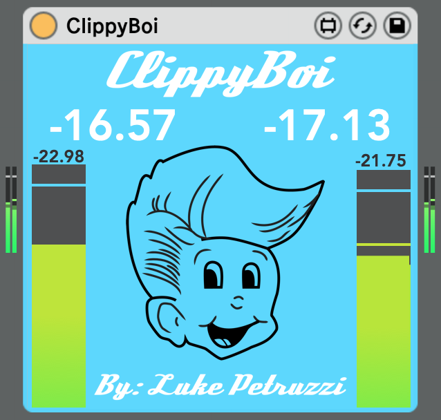 | Description: | ClippyBoi is a simple, lightweight plugin for monitoring gain and clipping between between plugins. Just drag a ClippyBoi anywhere in your device chain, and monitor away! The default gain meters between plugins in Ableton are too tiny, and make it hard to see if I'm clipping at all. ClippyBoi is usually happy and blue, but when you clip, he gets red and angry, and shows you where the loudest clip in the current track occurred. Watch the YouTube vid for more details and a demo! https://www.youtube.com/watch?v=YyiWVcR7fRY |