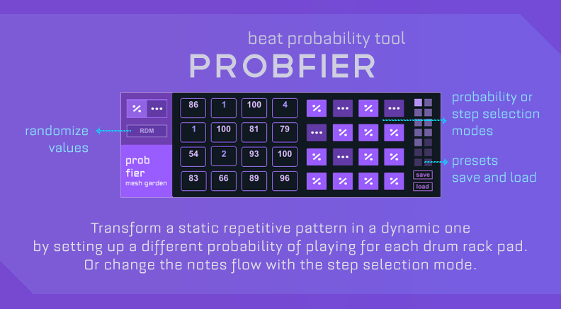 Description: Placed before a drum rack, Probfier gives you the ability to select between 2 modes per pad: Probability or Step selection.
