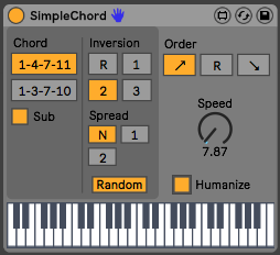 | Description: | With SimpleChord, you play a full chord with just one finger. SimpleChord is a M4L midi plugin. Update: I've added a Spread option, to create more chord variations. |