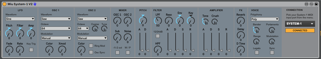 Those seem to work in the opposite direction. That is, I can change those parameters in Ableton via mouse or Push and the System-1 hardware responds. It's just when using the System-1 hardware that the device doesn't respond.