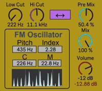 | Description: | Hi, This is a Spectral Convolvor audio effect. It cross synthesizes the Input audio with an FM oscillator. In particular, it convolves the first signal with the Spectral Amplitude of the second, or (if the double arrow button is pressed) it convolves the Spectral Amplitude of the first signal with the audio of the second. These are different. The FM oscillator has been updated with a patch from the man himself, John Chowning: https://cycling74.com/forums/carrier-and-harmonicity-in-fm-synthesis Pitch, Carrier, Modulator and Modulation Index controls are included. The sound is wildly affected by all of these. I included a spectrogram to see what each does to the FM oscillator. You can only really see what is happening for small values of the parameters, but you can tell that a lot of the controls are quasi periodic. As you experiment with small parameter values, you can kind of get an idea of what happens at the larger values. I recommend using the keyboard arrow keys to scan (Shift-arrow to scan faster). The Modulator display might show 222Hz, but if you use the arrow keys, you can usually find several spots before hitting 223hz (you can also type in values like 222.3, each of these usually sound different). The PreMix controls the amount of each signal (Input and FM) used in the convolution. It kind of acts like a volume knob since the FM Oscillator is at a fixed amplitude and convolution requires two nonzero signals to hear anything. The Lo and Hi Cut are applied to the Input before convolving with the FM. The Mix knob controls the mix between the Input and the Eq'd/Premixed/Convolved wet signal. I'm sure there are tons of bugs and alarms going off everywhere. Let me know in the comments and I can try to fix them. Share and enjoy Bugfix 1: I fixed the output routing so that it mixes dry and wet correctly. |