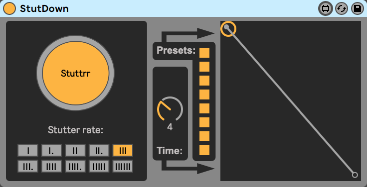 Usage: drop StutDown onto any MIDI or audio Ableton Live track, make some sound and press Stuttrr button to start granular pitch-down or build-up. If the envelope goes from 0 to 1, the pitch will go up. If the envelope goes from 1 to 0 the pitch will go down. An envelope set to a horizontal line will produce a static pitch. Click the envelope window to ctreate new points, shift-click to remove available points. Use Time dial change the envelope duration (from 1 to 10 seconds). The stutter rate buttons allows you to change the speed of the looping of the sound: the more vertical stripes - the faster is the granular effect. You can save up to 8 combinations of Stutter rate, Time Dial and Envelope in the Presets section. Shift-click the slot to save a preset, click to restore the preset.