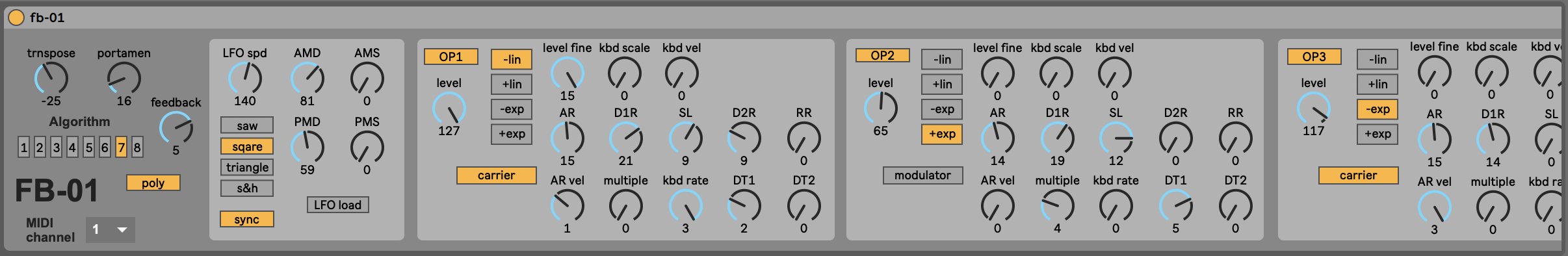 | Description: | Editor for the Yamaha FB-01. Allows to control the synth parameters via Sysex messages. Currently only sends parameter values, without reading the current state of the machine. So all parameters of the current voice are overwritten. Just drop the device onto a MIDI track and select the MIDI channel of the device. Changelog: 1.1 * AR knobs were swapped for operators 3 and 4 in previous version * changed order of operators (OP1 is now the one Yamaha calls OP1 in the manual) |