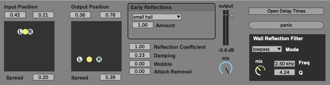 | Description: | A waveguide mesh reverberator built using mc and gen~ in max 8. Users may customize the frequency of delay between scattering junctions as well as the tapin and tapout points of the mesh. 0.3 changed early reflections to an FIR multitap system with 4 settings added a two-pole filter to apply to reflections 0.2.1 added "wobble" feature to modulate resonant frequencies randomly added attack removal feature 0.2.0 Added early reflections based on yafr 0.1.3 fixed issue with automation 0.1.2 efficiency improved through a simplification of the mesh algorithm 0.1.1 Fixed issue with parameters being recalled |