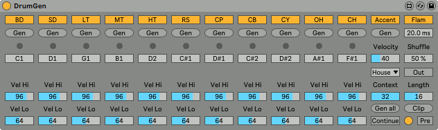 | Description: | A Max for Live 808/909-style drum pattern generator and sequencer based on a Lempel-Ziv model. Features: - Generate patterns specific to 11 different instruments - Create MIDI clips - Continue mode, continues an existing pattern - Patterns have low/high velocity - Additional total accent (configurable amount) - Select pitch and low/high velocity for each instrument - Shuffle - Pattern length between 1 and 32 steps - Select "House", "Breaks", or "All" style patterns - 909-like flam (configurable amount) - Presets - Select out clip which gets updated permanently More info at GitHub (see below). Demo at https://youtu.be/8KpjvNGndvg The device name had to be changed from DrumGen to avoid trademark issues 🙄 v1.1: - Add out clip - Add play toggle v1.2: - Update out clip when parameters change v1.2.1: - Fix preset storage bug v1.2.2: - Rename v1.3.0: - Fix grouped device bug - Add MIDI mappable preset recall - Update for Live 11 |