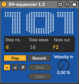 | Description: | SH-equencer is a step sequencer based on the Roland SH-101 sequencer. Press "Record" and the device records the notes you play into it, including legato notes. Use the "Rest" button to leave a step empty. "Clear" deletes all steps. Press "Play" to leave record mode and play the sequence. The sequence is then triggered and transposed by notes coming into the device, which makes it easy to generate complex evolving sequences if you wish. The sequence can be played forwards , backwards or in palindrome (forward then backwards) mode. Click 101 to choose your favourite colour! The sequence is saved with the device so it will load with your live set. |
