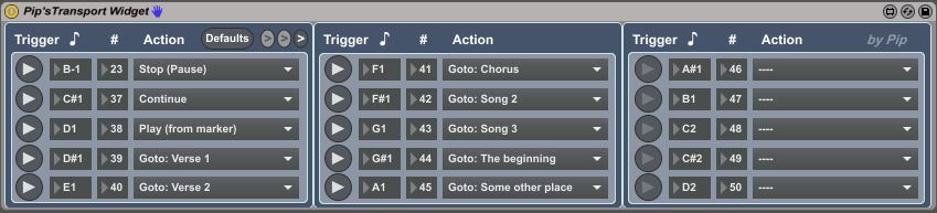 If you are constructing a set in arrangement mode you will probably be familiar with the issue of running straight into the next song even if you are not ready. I built this widget so that I could trigger a stop by simply putting a note in a dummy midi track. I added some other transport functions for good measure, such as jump to a locator, play. The jump to locator allows you to rearrange your set without having to restructure your arrangement. It is also possible to use dummy clips in a midi track to start at any point in your set, just set a locator and map a note to it in the widget. I realise you can do this with regular midi mappings, but the widget makes it more explicit.