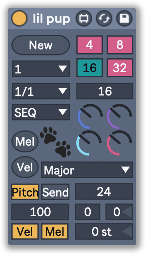 | Description: | Lil pup is a utility that generates random looping sequences. The output can range from simple to complex depending on how you set it up. Every time you click “New” Lil pup will make its next pattern and loop forever until you change it. There are lots of parameters to adjust how Lil pup will behave but you will very rarely get the same output twice. Now featuring eight pulse sends across two sequences (page 2). This turns each of the smartphones devices into a "lil pup expander" allowing you to integrate their functions into your sequences. |