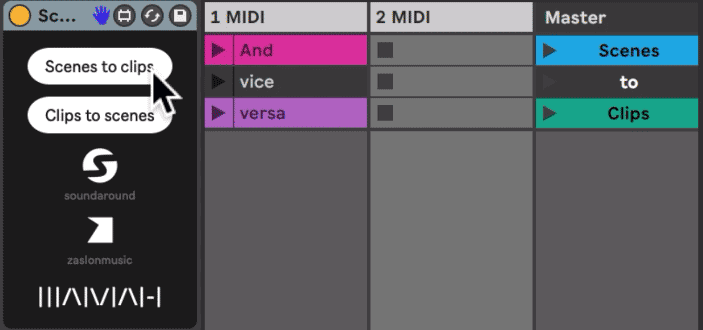 | Description: | Copy scene names to clips and vice versa. Useful for transferring scenes names to another project. Release notes: v.1.3 - Now the device has the option to choose to transfer scenes names and colours to all the clips. v1.2 - Now device transfer colors v1.1 - Now Scene Namer can read up to 999 scenes and clips instead of 127 only in v1.0 - Clips to Scenes bug fixed. Previously it was impossible to copy names from clips to scenes if there are empty clips slots on the track. v1.0 Release Live 9 and 10 |