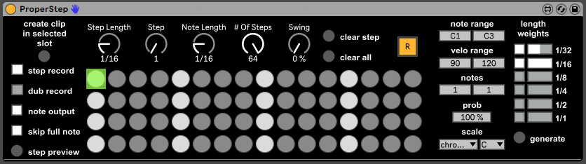 | Description: | While I know Live has some nice step sequencing/recording functionality, it's just not quite right (personal opinion). Recently acquired a Korg Minilogue and while using the step sequencer, remembered how nice and fluid hardware based step sequencing and recording has always been! ProperStep is an attempt to emulate this. Simply select a step, enter a note/chord and move on! You can even seamlessly create MIDI clips for use in your arrangements. (Just click on a clip slot in the track the device resides on and click the "Create Clip..." button!) Ability and parameters exist to generate random sequences as well! Enable "Info View" in Live and hover over the various controls to learn what everything does! Enjoy and have fun! Demo Video: https://youtu.be/cdJscZeBChM If you care to show some support or say thank you, give a listen to my latest release on Werkstatt Recordings! A synthwave/throwback sort of sound to a lot of artists that inspired me to ever pick up synths and drum machines! Jon Benderr - Observer https://synthesizer.bandcamp.com/album/311-jon-benderr-observer |