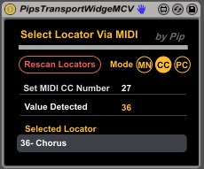 | Description: | Transport Widget - Midi Control Version After the success of Transport Widget V1 I was approached by a forum member to build this variation of the transport widget. Although very specific in function, I have posted it here in case anyone else finds it useful. What does it do? It monitors midi input on a channel and on receipt of a specific MIDI message it will then make the transport jump to a specific locator position. Depending on the mode defined by the mode button, the trigger to jump can be either (MN) a MIDI note value, (CC) a controller value, (PC) a program change value. When in CC mode the controller number the widget monitors is defined by the value entered in the Set MIDI CC Number box. This is ignored when in MN or PC mode. When detected the MIDI note, Controller Value or Program Change number will then be taken as the place that the widget will jump to amongst the various named locator positions. These are the little flags in the scrub area at the top of the arrangement view window. The mapping of these values to a locator position is defined and explicit in the locator name itself. For example a locator name “ 6 – This is the place to go to” will be the place the widget will jump to when it detects a value 6. The locator naming convention or syntax is simple and in the form a 1 2 or 3 digit number at the beginning of the locator name followed by a “-“minus sign e.g. “nnn-some text” Spaces are ignored, as are values above 127. If duplicate locator values are found, usually the last name created will take priority. The “Rescan Locators” button does what it says on the tin. If you have added or deleted any locators, then hit this button to refresh the value to locator mappings. I was asked to make this a manual button to minimise CPU usage, rather than continually checking for any changes in locator names. I hope you find it useful. As usual let me know if you find any bugs. |