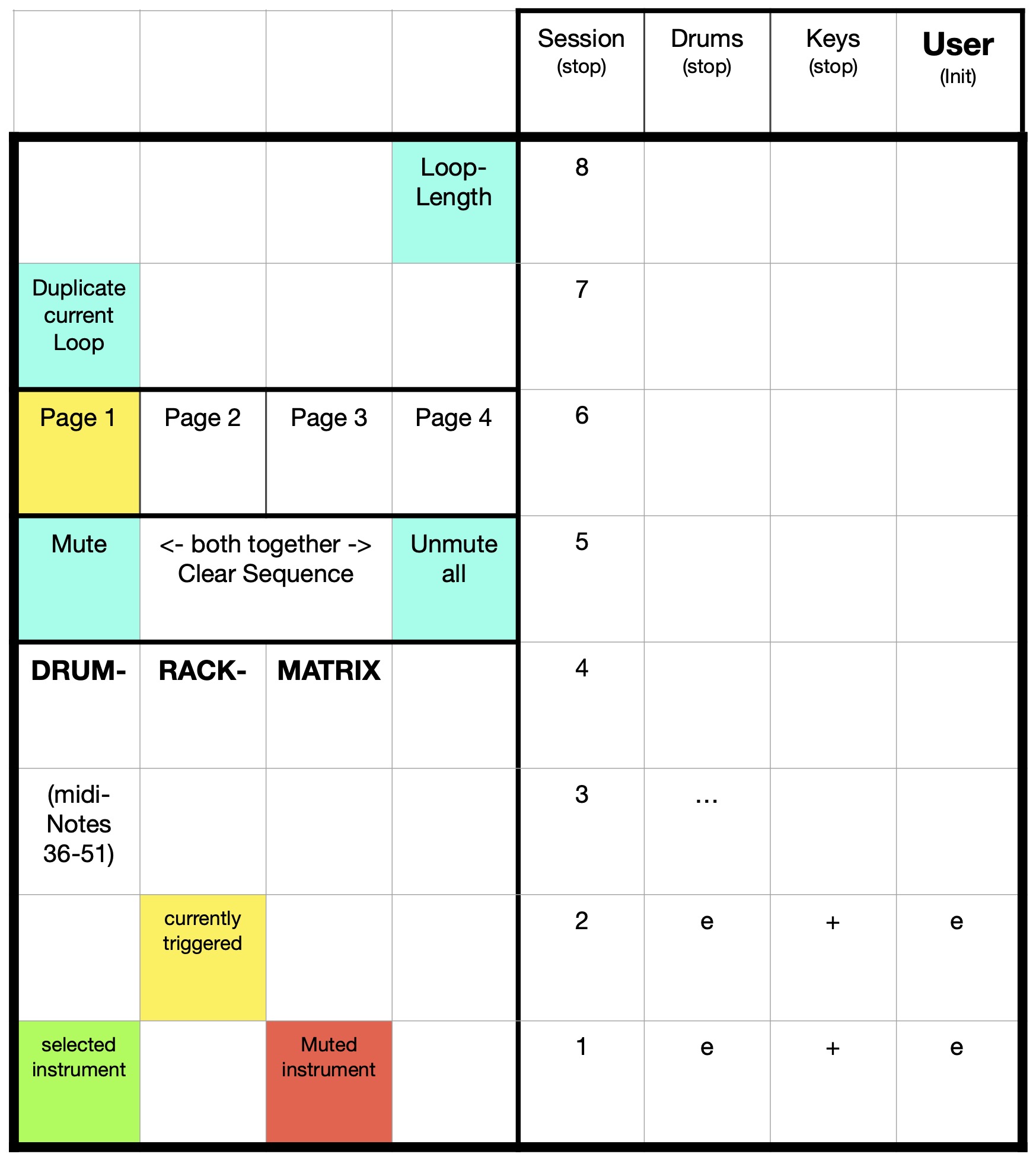 Drum Rack (from bottom to top): 36 (C1) to 51 (D#2)